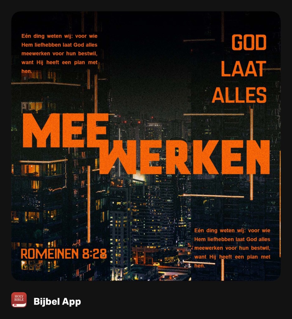 Dan mogen het geen loze worden zijn, dan is het een belofte waar we in mogen gaan staan. Hoe moeilijk de situatie ook is. We mogen nooit vergeten dat dit hoofdstuk, een van de mooiste wel uit de Bijbel, afsluit dat we meer dan overwinnaar zijn, door Christus, die ons heeft liefgehad. Als we in de problemen komen mogen we deze tekst gebruiken om op Gods beloften te gaan staan en het te proclameren. Wat mij nu gebeurt zal God doen medewerken te goede, het komt goed!