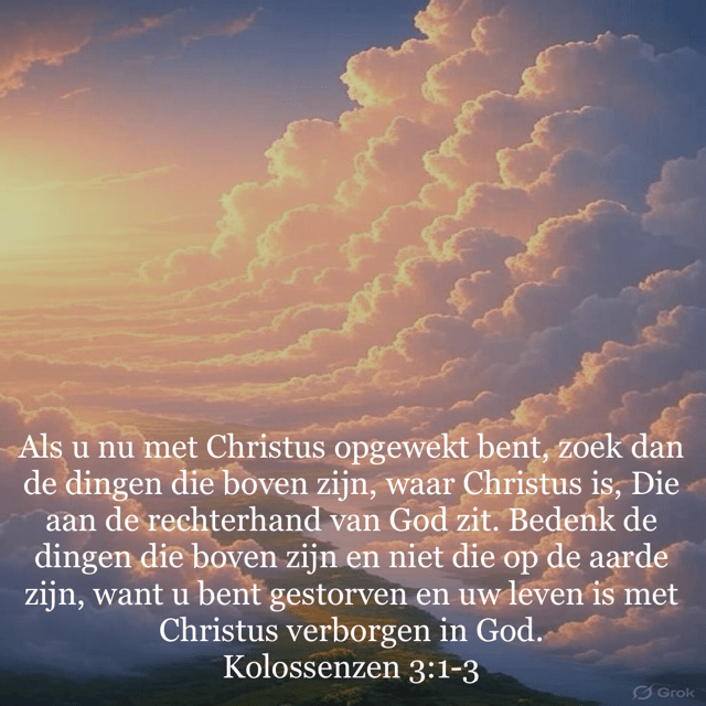 je bent met Christus opgewekt. Jouw echte leven? Dat is niet hier, in de chaos van het alledaagse, maar boven, waar Christus regeert aan Gods rechterhand. Wat als je vandaag je ogen opslaat? Niet blijven graven in aardse problemen, maar je hart richten op de eeuwige hoop, de liefde en de vrede die in Hem gevonden worden. Laat je leven stralen vanuit die verborgen plek in God, waar je écht thuishoort. Wat kies jij vandaag: de dingen van de aarde of de schatten van boven?Waarom blijf je graven in aardse zorgen?