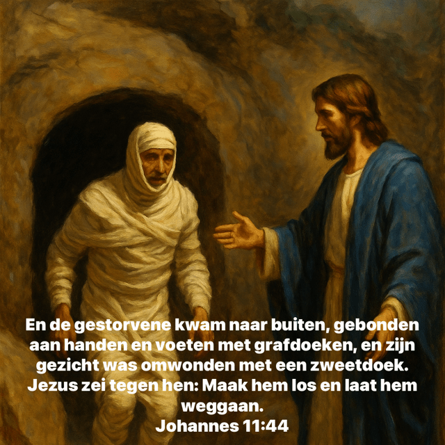 “En de gestorvene kwam naar buiten, gebonden aan handen en voeten met grafdoeken, en zijn gezicht was omwonden met een zweetdoek. Jezus zei tegen hen: Maak hem los en laat hem weggaan.” (Johannes 11:44, HSV)
