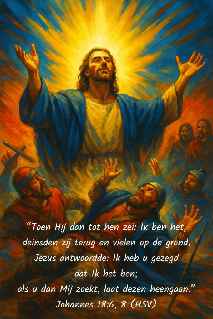 âToen Hij dan tot hen zei: Ik ben het, deinsden zij terug en vielen op de grond. Jezus antwoordde: Ik heb u gezegd dat Ik het ben; als u dan Mij zoekt, laat dezen heengaan. Johannes 18:6, 8 (HSV)âŹâŹ